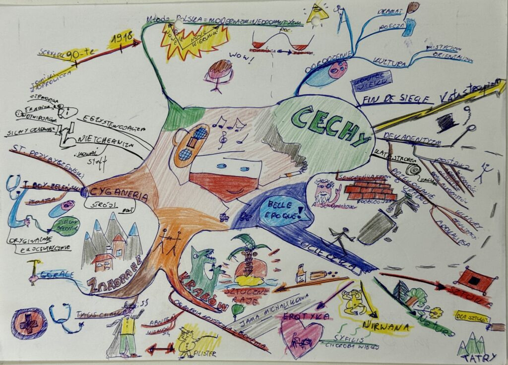 Po pierwsze im nudniejsza lekcja, tym ciekawsza notatka. Widać to w moich notatkach z polskiego – Młoda Polska i głupie skojarzenia z nią to była dobra rozrywka, która dodatkowo wspomagała moje zapamiętywanie. Nawet gdybym miał ją wyrzucić od razu i nigdy więcej na nią nie popatrzeć po danej lekcji to samo zrobienie jej dawało mi skupienie przez całą lekcję.